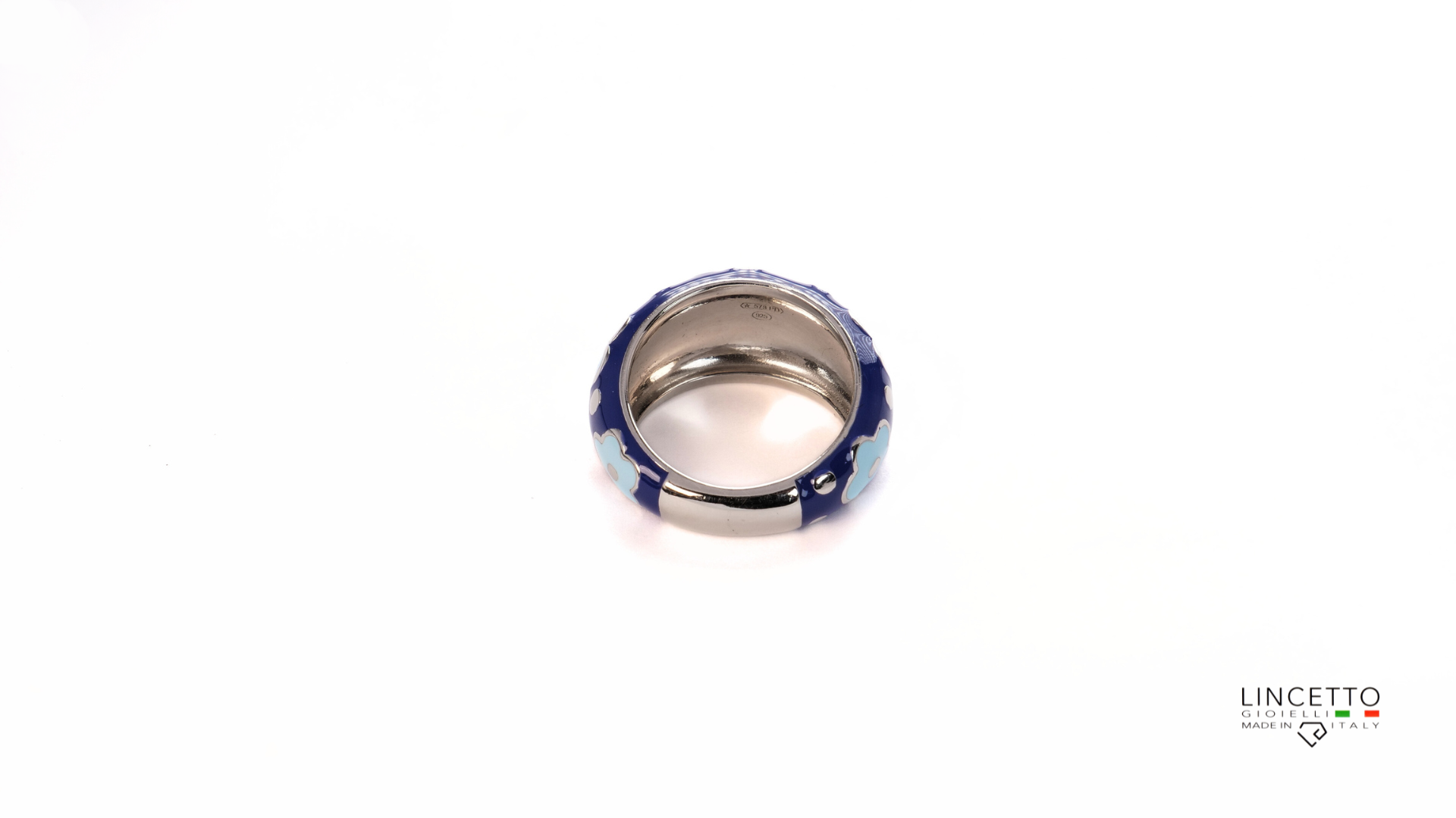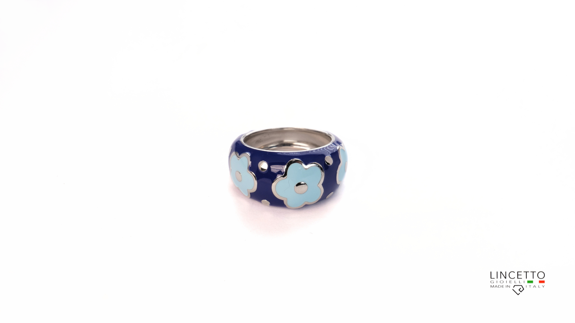 Rhodium-plated 925 silver ring with blue enamel flowers and blue background.