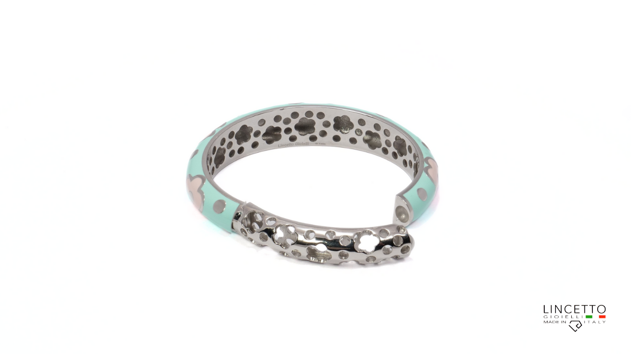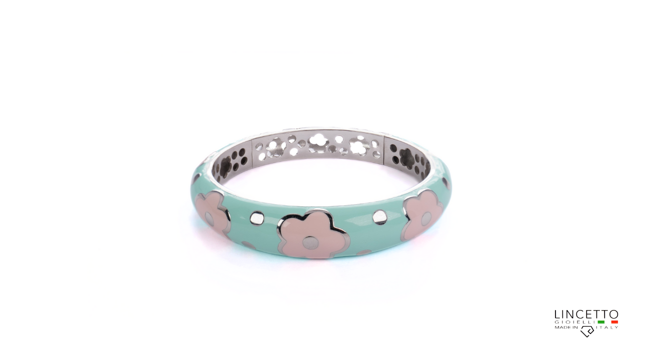 Add a touch of freshness and color to your look with this beautiful enameled floral bangle from our Flora Collection. Crafted with care and attention to detail, this bangle features a vibrant floral pattern that combines delicate peach enameled flowers on a milky and mint background, creating an elegant and refined contrast.