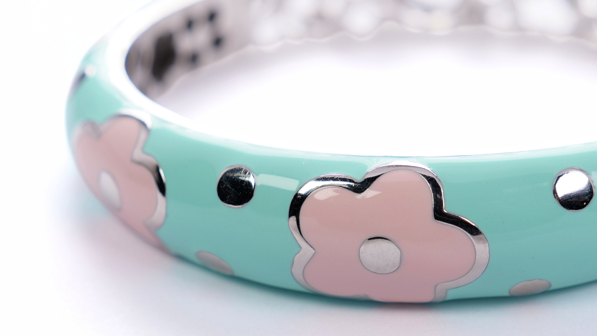 925 silver rhodium-plated slave with peach enamel flowers and milk-mint background.