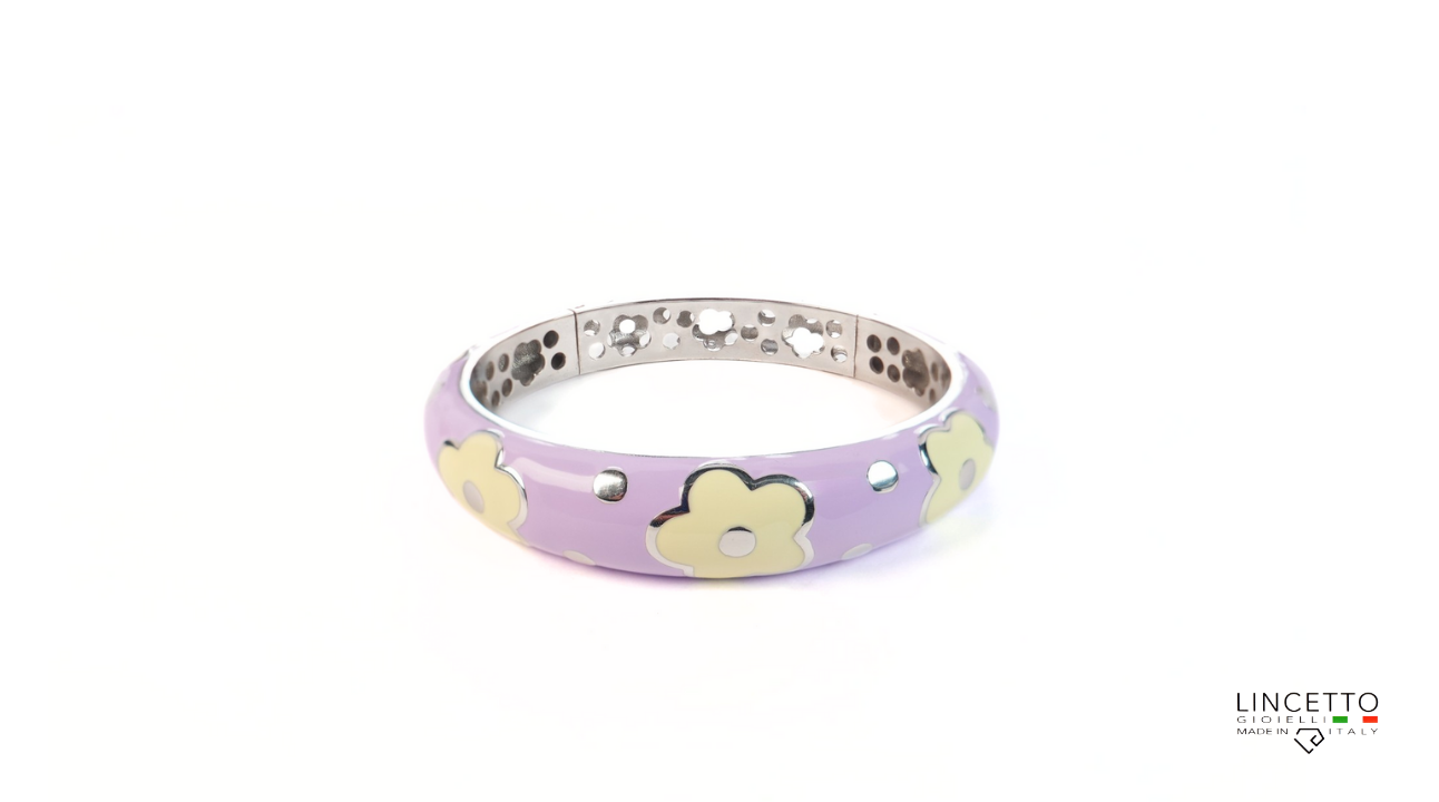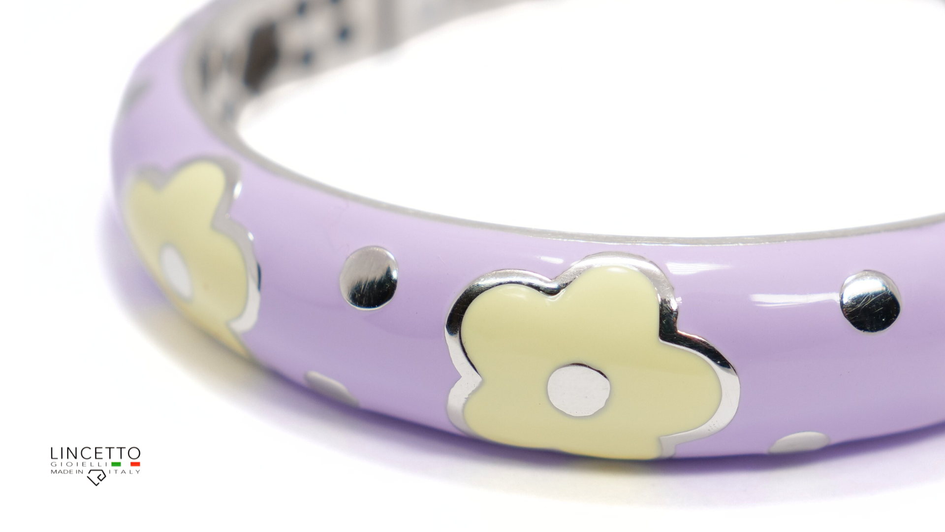 Add a touch of freshness and color to your look with this beautiful enamel floral bangle from our Flora Collection. Crafted with care and attention to detail, this bangle features a vibrant floral pattern that combines delicate yellow enamel flowers on a lavender background, creating an elegant and refined contrast.