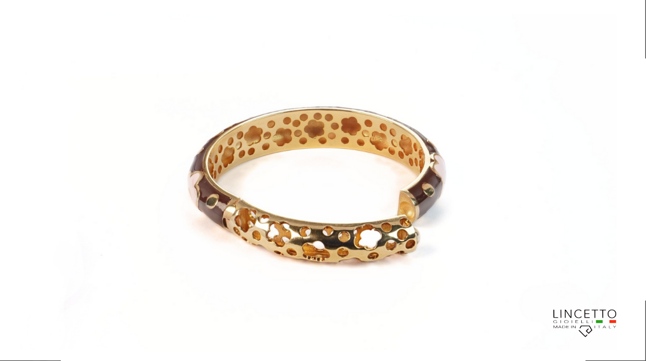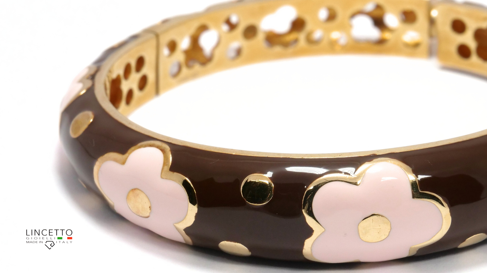 Add a touch of freshness and color to your look with this beautiful enameled floral bangle from our Flora Collection. Crafted with care and attention to detail, this bangle features a vibrant floral pattern that combines delicate antique pink enameled flowers on a brown background, creating an elegant and refined contrast.