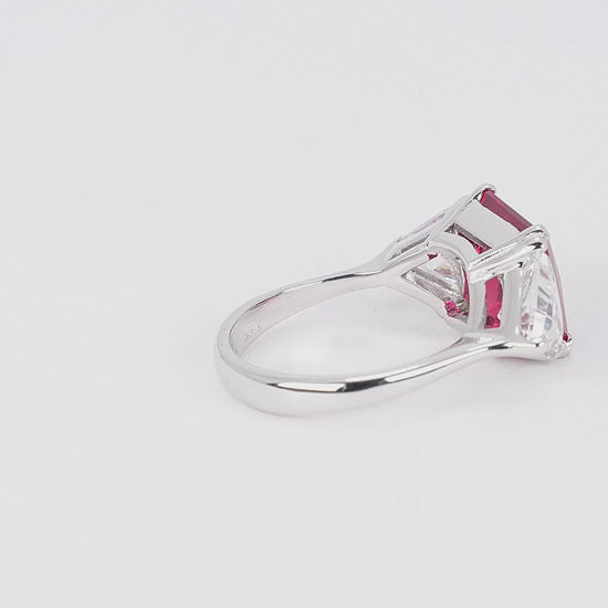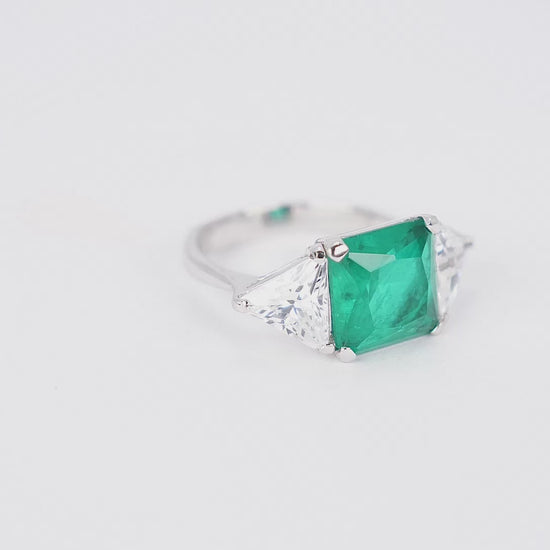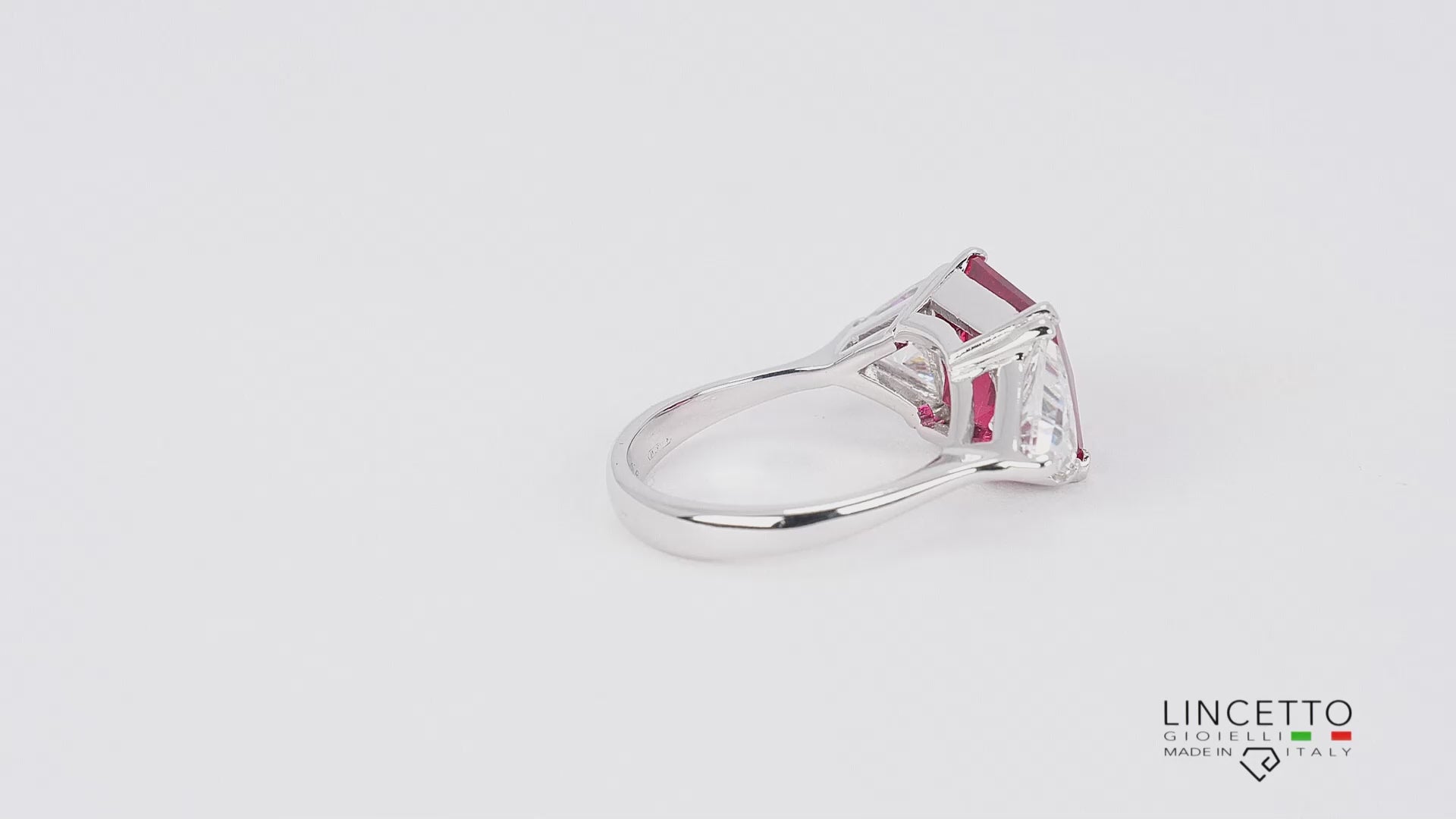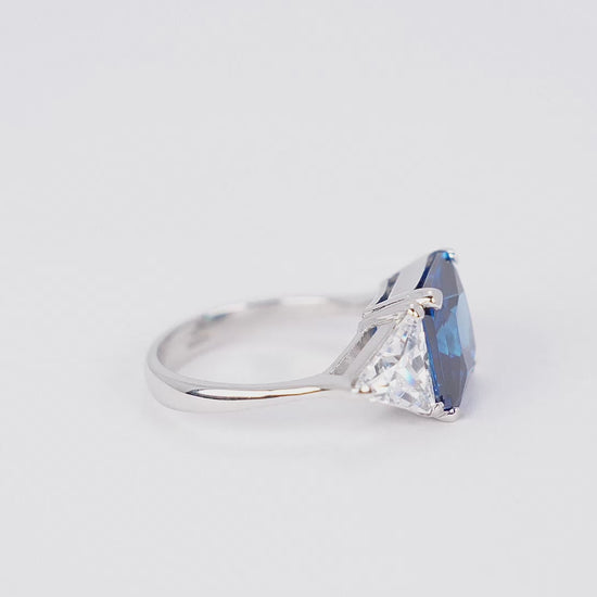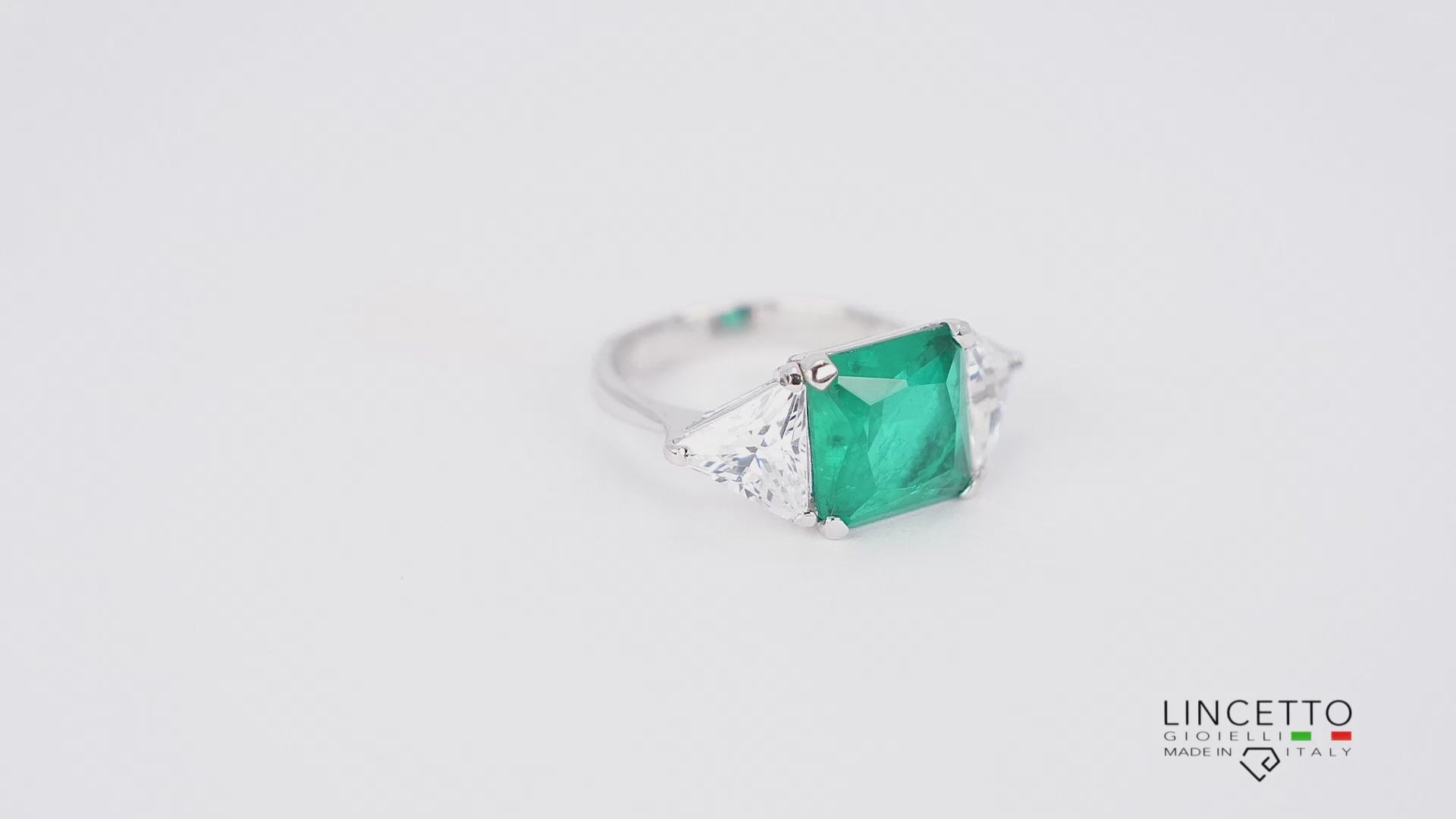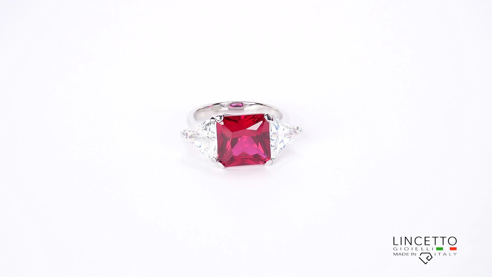 Anello in argento 925 rodiato con pietra centrale carrè sfaccettato 10x10 e pietre laterali a triangolo bianche di prima qualità.