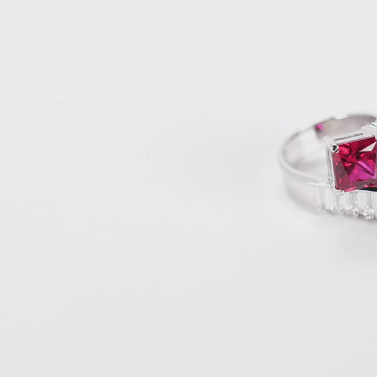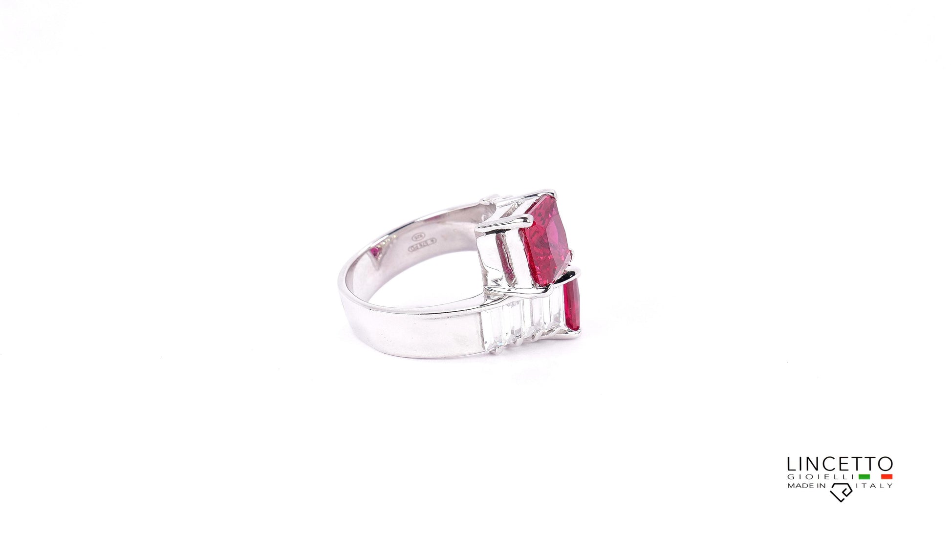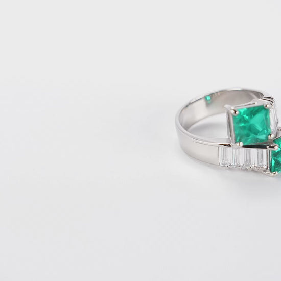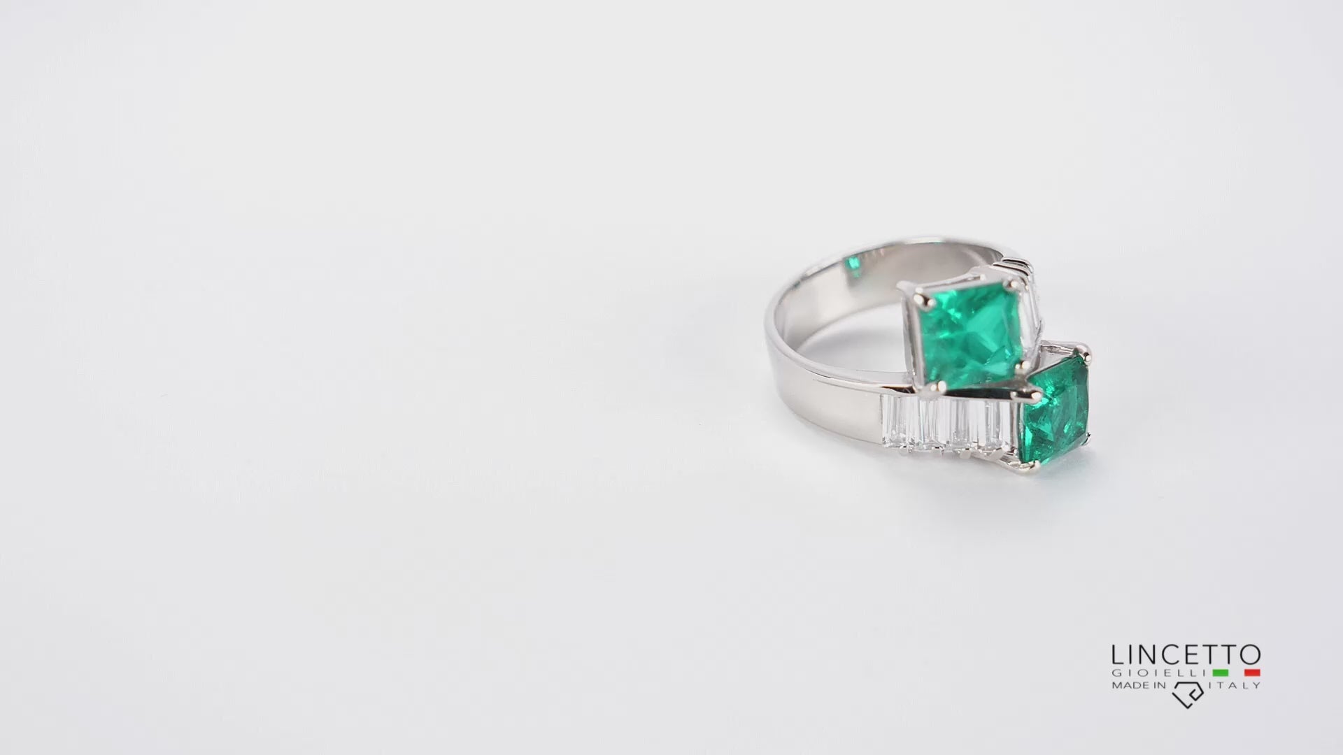 Anello contrariè in argento 925 rodiato con due pietre centrali carrè e baguette bianche di prima qualità.
